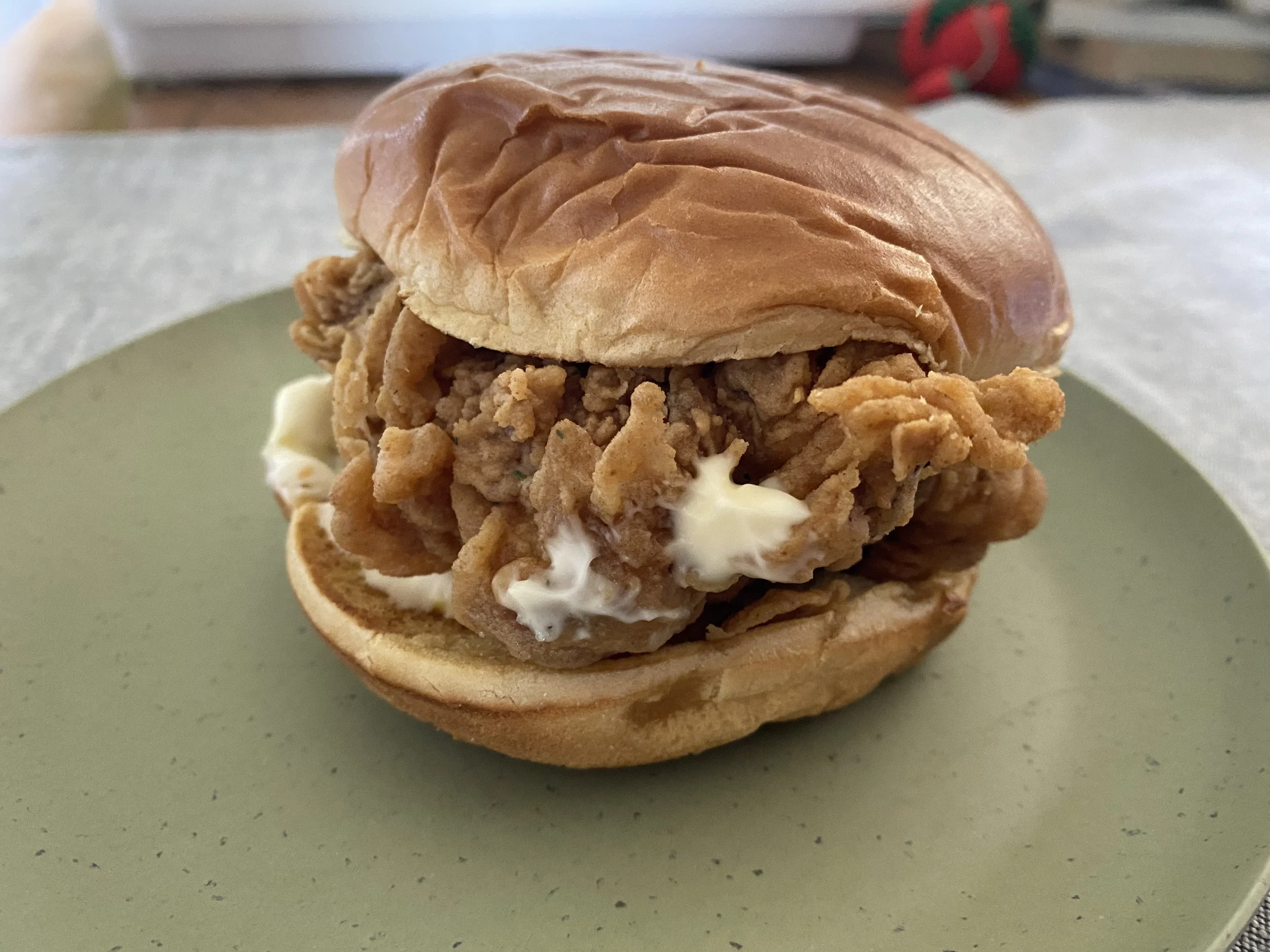 Bread is a little dry, and bottom squishes into nothing due to the large piece of chicken